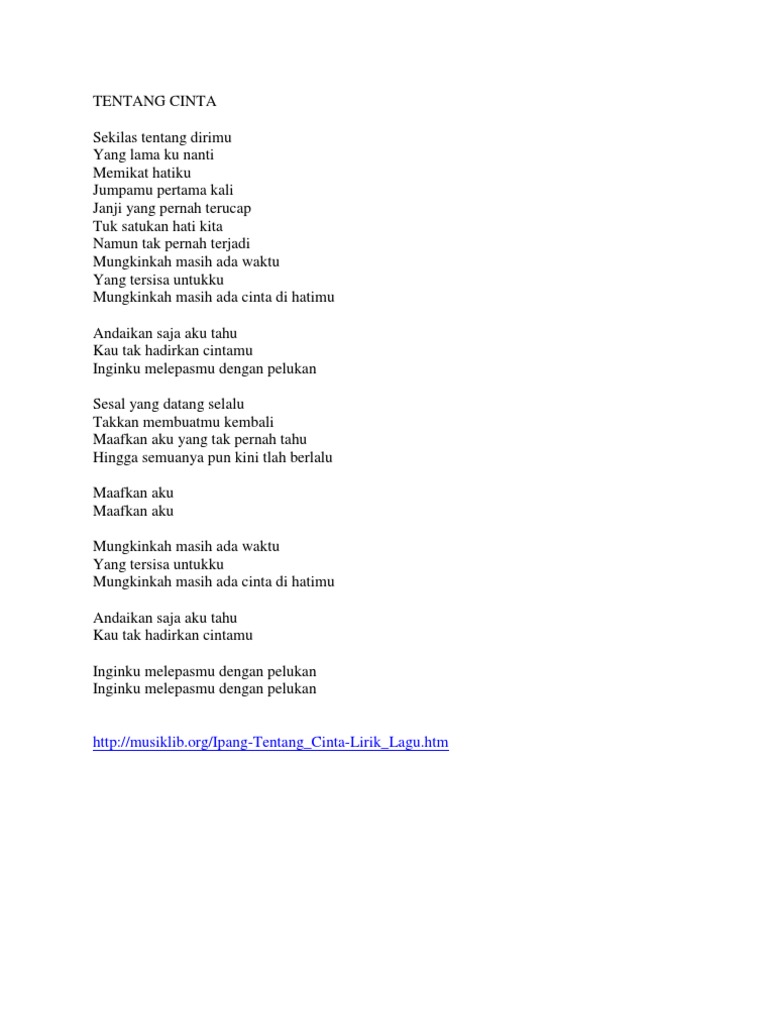 Lirik dan Chord Gitar Tentang Cinta - Ipang Mungkinkah Masih Ada Waktu. TIPS PENCARIAN LIRIK FAVORIT ANDA. Atas nama jiwa dan hati tulus ikhlas.